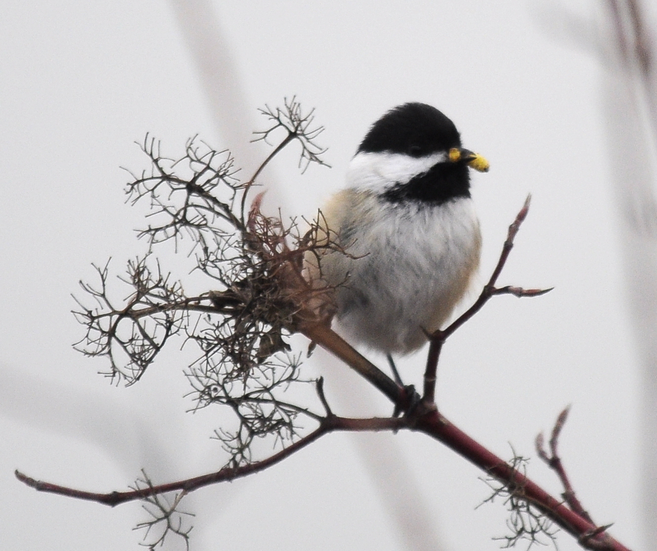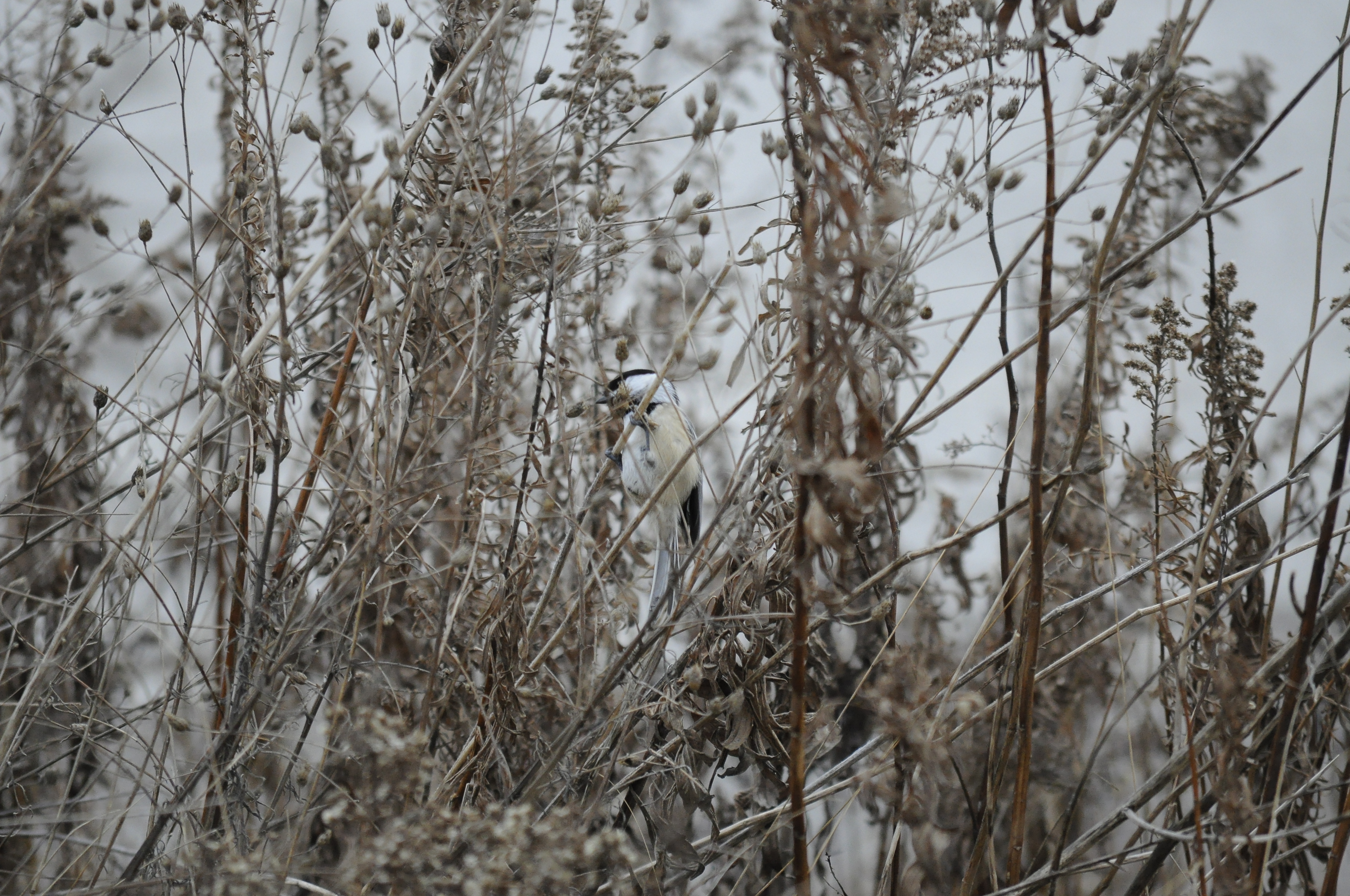 A chickadee eating a seed.