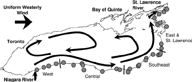Water current in Lake Ontario, dictated by the large Niagara River. There is an odd current near the Bluffs. Here it is shown going west to east, but closer to shore it rotates east to west.