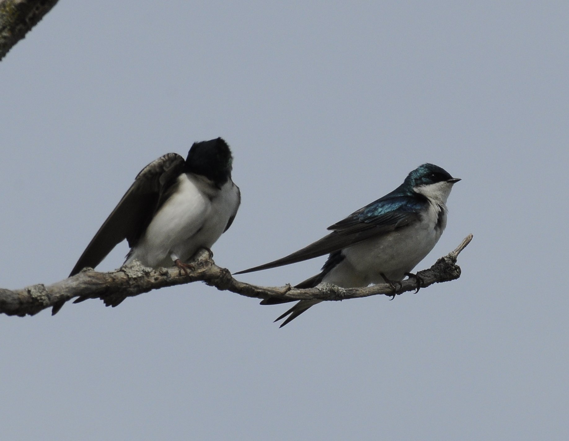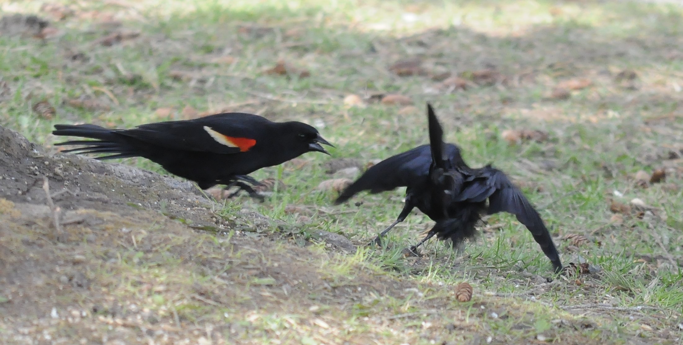 Red-winged Blackbird and a Brown-headed Cowbird. Territorial.
