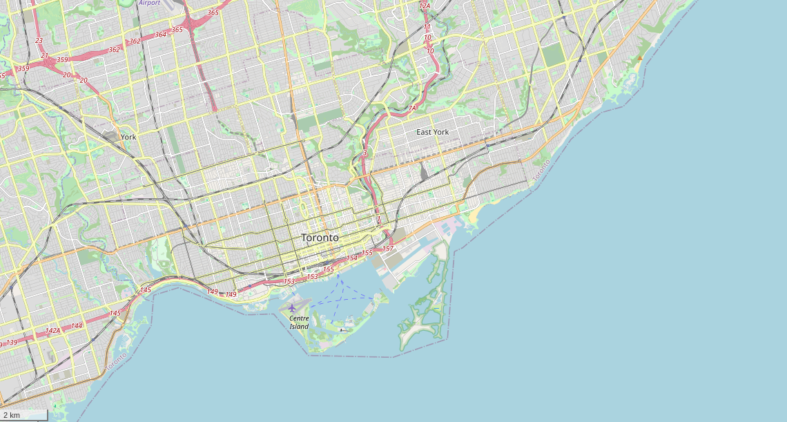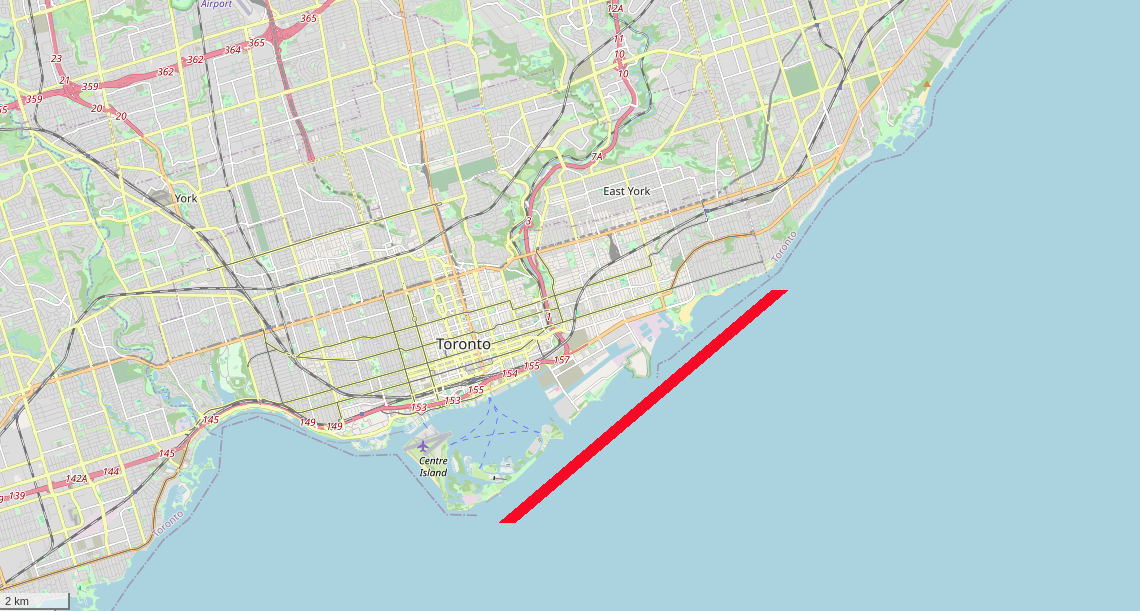 Without the artificially created Leslie Street Spit, a clearer picture. The R. C. Harris Water Treatment Plant is at the corner, dividing the Bluffs and the long sand bar that formed Ashbridge's Bay and the Toronto Islands.
